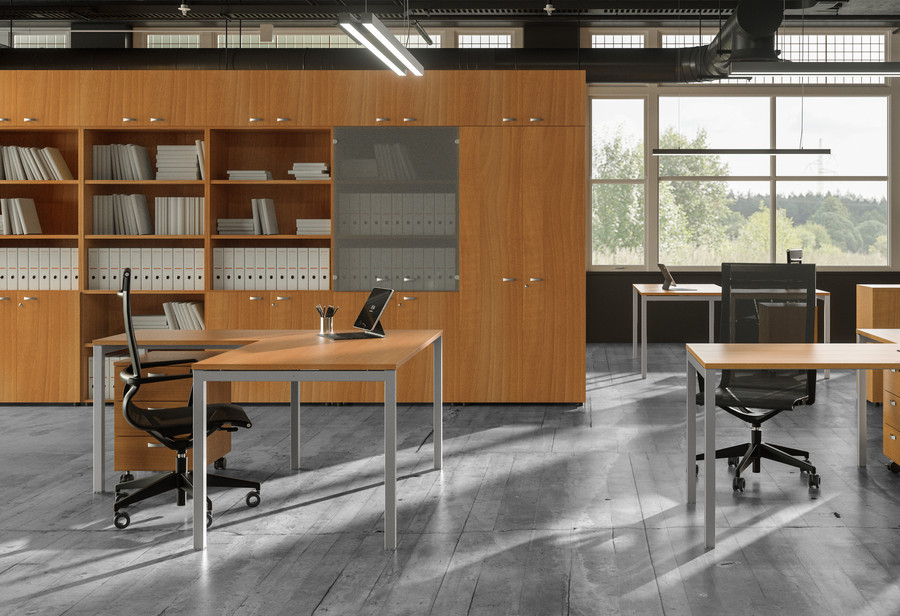 Piani scrivania sp. 22 mm, in melaminico antigraffio e antiriflesso. Bordi dei piani scrivania e ritorno in abs in spessore 2 mm. antiurto , assenza di spigoli vivi.