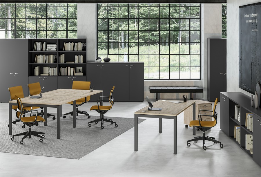 Piedini regolabili. Quattro ripiani di cui 3 regolabili in altezza nella versione alta. Possono ospitare i raccoglitori fino a h.36 cm.